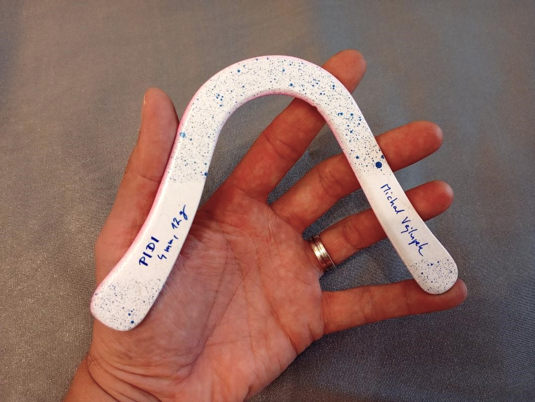 IZY-RAY pro noční házení. Letecká překližka, epoxy pryskyřice. elektrický obvod s přepínačem a výměnnou baterií.